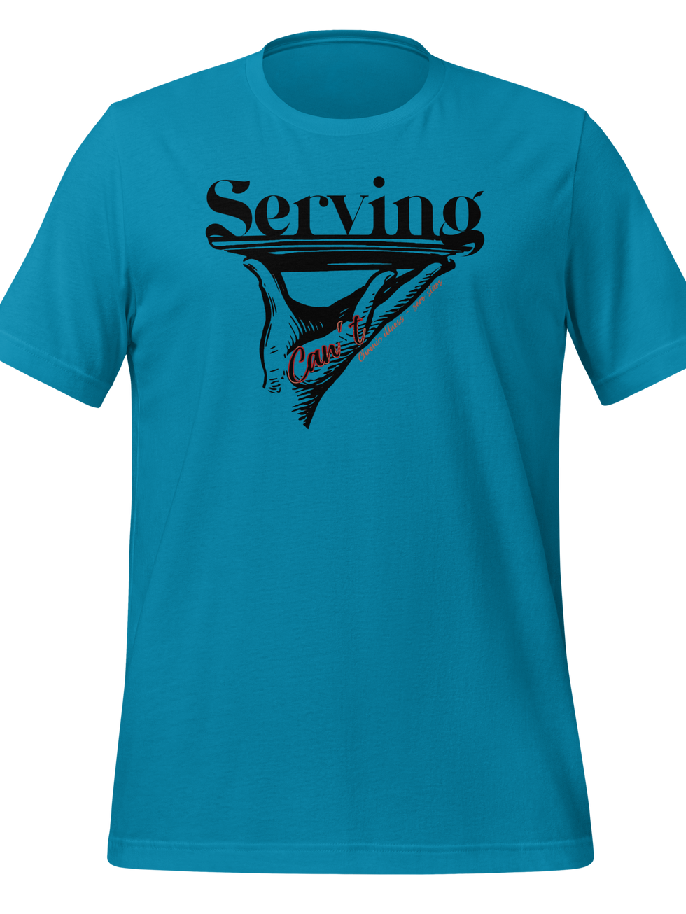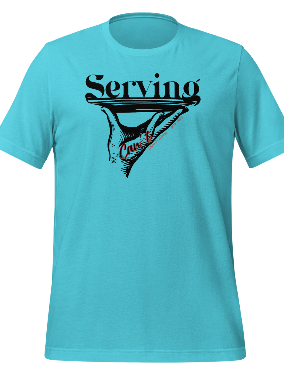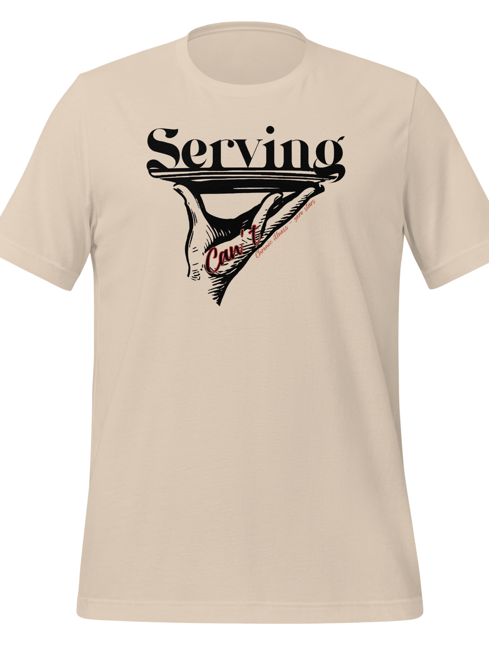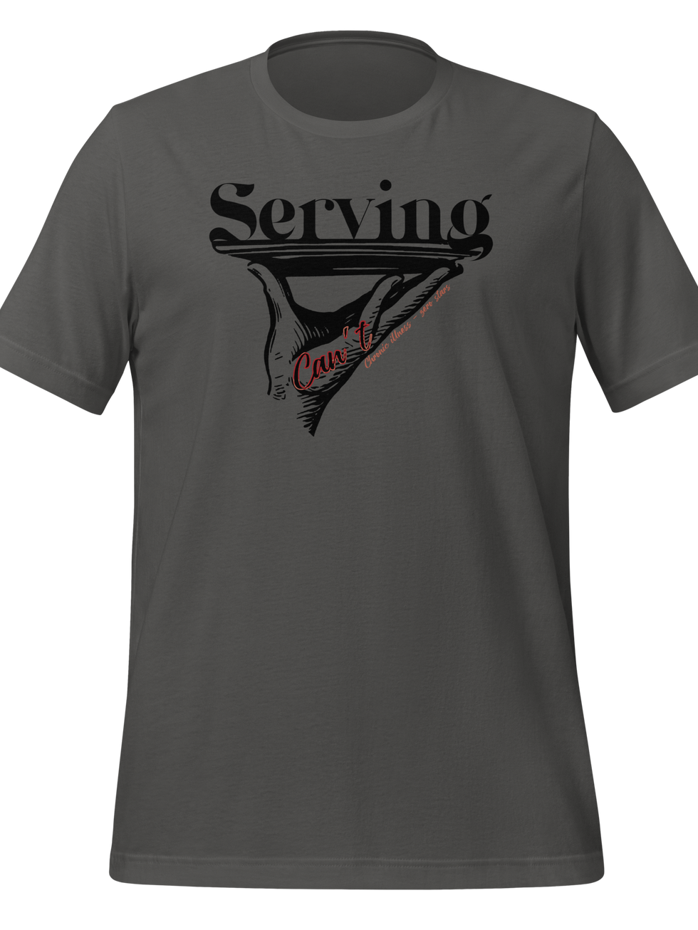 SERVING CAN’T / CI - It's like "serving c(v)nt"* but for chronic illness peeps. This design is a hand holding up a plate with the word SERVING on top of it. Inside the had is the word “Can’t”; alongside the hand is “Chronic illness - zero stars”. When all you can serve is cannot.