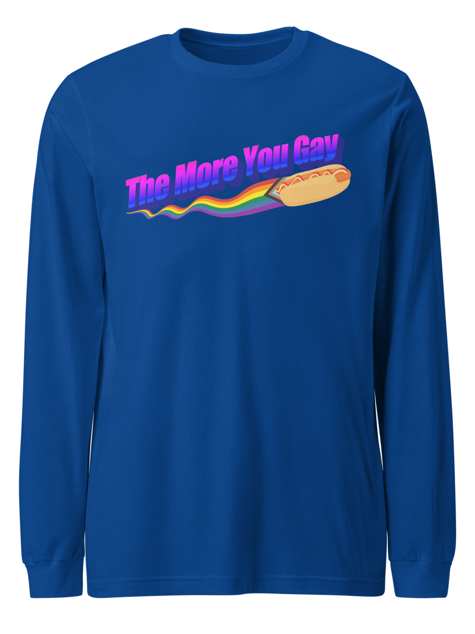 TMYG / HOT DOG - Yes we know this is unhinged. This design is “THE MORE YOU GAY” in the classic throwback font, with a pride flag trailing after a shooting hot dog. Everything is nuts. Why not add this to the mix.
