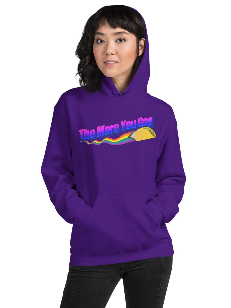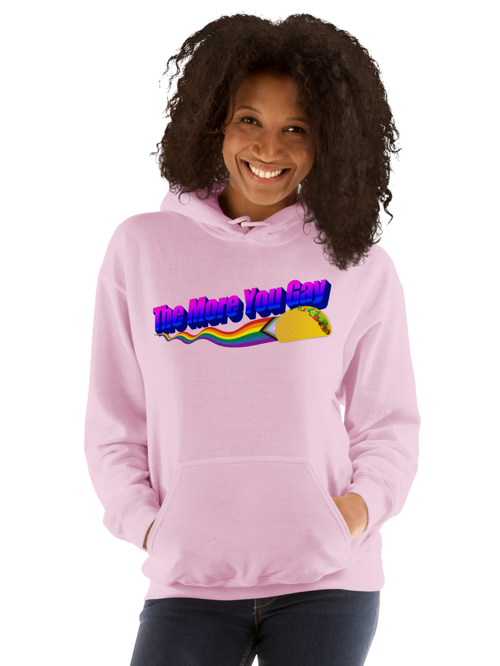 TMYG / TACO - Yes we know this is unhinged. This design is “THE MORE YOU GAY” in the classic throwback font, with a pride flag trailing after a shooting taco. Everything is nuts. Why not add this to the mix.